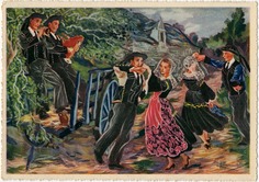 Les jeunes femmes portent un costume de cérémonie du pays de Baud des années 1925-1940. Leur coiffe, la coiffe « dite de Baud », se portait pour les grandes occasions, en particulier pour la mariée et sa demoiselle d’honneur, car très coûteuse. Elle est en réalité une évolution de la Kornek, dont la bande de tulle a disparu au fil des ans pour n’être plus visible vers 1925. Les dernières à porter fièrement la coiffe dite de Baud se parent d'une coiffe rendue presque transparente par une mosaïque de points d'araignée. Les hommes, quant à eux, portent des costumes du dimanche et/ou de cérémonie (voire du quotidien), de 1870-1925, et plus précisément de la fin de cette période. Les deux sonneurs arborent un costume du pays de Baud, tandis que le danseur sur la droite porte ce même costume mais pour meunier, typique par sa couleur bleue. Le danseur au centre arbore quant à lui une veste du pays de Pontivy (mais également portée dans le pays de Baud) dont on surnomme ses porteurs « les moutons blancs », avec en-dessous un gilet noir du pays de Baud.