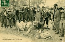 Même cliché que la CP AA37124. Le Langueyeur était chargé de détecté la laderie chez le porc vivant destiné à la vente. Ce vilain mot de larderie désigne la maladie parasitaire provoquée par la présence de cysticerques (formes larvaires de certains ténias). Pour opérer le Langueyeur couchait le porc sur le sol et l’immobilisait en appuyant un genou sur l’épaule de l’animal. Ensuite à l’aide d’un bâton, il lui écartait les mâchoires, ce qui lui permettait, en passant les doigts sous le frein de la langue, de s’assurer que des grains ladriques ne s’y trouvaient pas lovés. (Source : www.histoire-en-questions.fr)