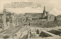 Le Théâtre Romain d’Arles a été saccagé sous l’épiscopat de Saint-Hilaire, vers 446.Il n’en subsiste aujourd’hui qu’une partie de l’enceinte extérieure et des gradins et deux colonnes de marbre qui décoraient le fond de la scène. Il avait 163 mètres de diamètre et pouvait contenir 15000 spectateurs. (Série Arelas)