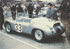 les mutuelles du mans vous offent cette carte postale à l’occasion des 24 Heures du Mans 1985 1960. La barquette PORSCHE n° 33 de BONNIER et HILL