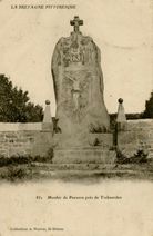 Le menhir de Saint-Uzec est localisé le long de l’ancienne route reliant le bourg à Penvern, au lieu-dit Placen-ar-Peulven sur le cadastre de 1819. Taillé dans du granite local, il est situé dans un enclos ayant un accès par échalier et mesure au total 7, 40 mètres de haut. Sommé de deux volutes sculptées, il est couronné d’une croix ornée d’un Christ en croix et de deux calices recueillant le sang qui coule sous chaque main. Il présente vingt-sept sculptures en bas-relief se rapportant à la Passion du Christ : Vierge agenouillée en prière, voile de sainte Véronique avec la sainte Face, croissant de lune et soleil, calice de Gethsémani, coq de saint Pierre perché sur une colonne, pièces de monnaies, fouet, sabre, épée, lance, marteau, tenaille, dés, clous, échelle, couronne d’épine, tunique, crâne d’Adam, lance de Longin et tige d’Hysope portant l’éponge, aiguière de Ponce Pilate, lanterne et pot à onguent. Un grand Christ en croix peint, aujourd’hui disparu, complétait ce décor (source Inventaire général du patrimoine).