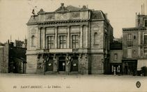 Le Théâtre annonce une EXPOSITION DES BEAUX-ARTS SOCIETE ARTISTIQUE DES COTES-DU-NORD. A droite le RESTAURANT DU THEATRE MARIN LE BRAS