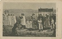 La bénédiction des blés en Artois est présenté au Salon de 1857, en même temps que Des glaneuses de Millet, ce vaste tableau a vallu à jules Breton une médaille de deuxième classe. Marque de consécration officielle pour un artiste encore jeune, l’oeuvre est même acquise par l’Etat pour le musée du Luxembourg. Il faut dire que cette représentation de la vie rustique est plaisante, comparée à la vision plus réaliste de Millet. A travers ce tableau, nous assistons à une procession des Rogations, qui se déroule dans les trois jours précédent l’Ascension. Aux alentours de Courrières, le village natal de Breton. Les jeunes filles en communiantes, le clergé, les notables locaux arpentent la campagne pour attirer sur les récoltes à venir la bénédiction du coel. La scène met en lumière la place importante du christianisme dans la vie rurale. L’artiste a multiplié les études précises des costumes ou des visages. Il privilégie une composition en frise qui n’est pas sans rapport avec Un enterrement à Ornans de Courbet. Mais si ce dernier à audacieusemeent traité un sujet contemporain avec les figures grandeur nature de la peinture d’histoire, Breton peint les personnages en petit format et reste donc dans le registre de la scène de genre. C’est à ce côté anecdotique qu’il doit ses innombrables succès en France et aux Etats-Unis. Devenu membre de l’Académie des Beaux-arts en 1886, Breton fait alors figure d’artiste officiel de la vie paysanne. Source: site Internet du musée d’Orsay.